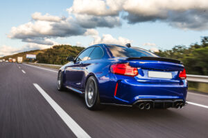 back-view-blue-sedan-road